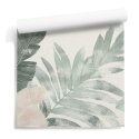 Tapeta z delikatnym motywem liści w subtelnych odcieniach beżu i zieleni to harmonijna dekoracja, która wprowadza do wnętrza świeżość i naturalny spokój.